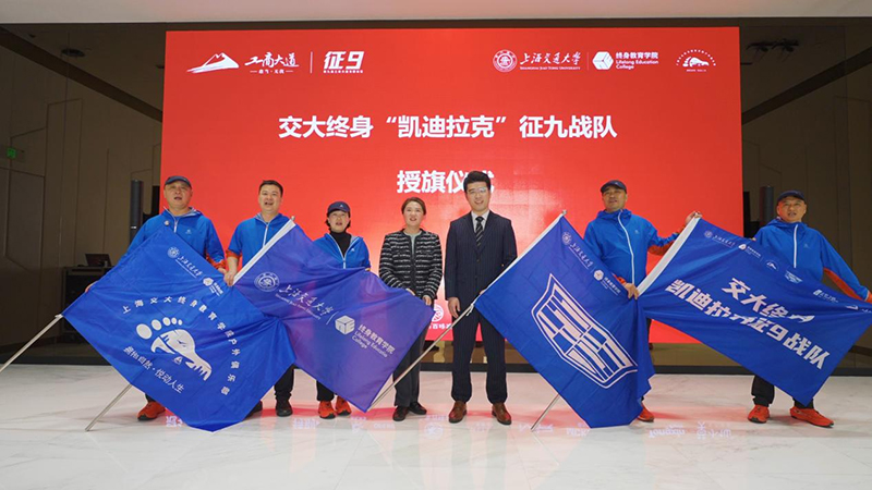 在冠名支持单位代表赞助支持单位代表凯迪拉克东南区市场推广经理杜弘晟、浦江凯迪市场经理吴晓玲的见证下,校友服务中心主任孙延敏和交大终身征八战队队长任卫哲分别为交大终身征九领队王飞和征九队长宋宏青授旗。