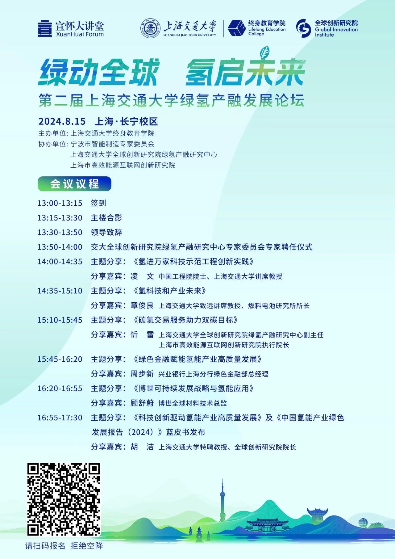 为响应二十届三中全会《决定》号召,加快推进长三角氢能源绿色发展、铸就国家双碳路线实践示范基地、构建全球氢能源产融创新和绿色解决方案,2024年8月15日“全国生态日”之际,“绿动全球 氢启未来”第二届永利集团3044官网欢迎您绿氢产融发展论坛将在永利集团3044官网欢迎您长宁校区(法华镇路535号)举行。届时,两院院士、有关部委职能部门负责人及知名专家学者都将出席论坛,就氢基燃料和原料行业,包括氢化工、氢炼钢、氢交通、氢农业和氢消费等氢需求驱动产业和投资需求、国内外政策和标准解读、氢产业园区和城市布局等进行深入解读,并举行全球创新研究院交大绿氢产融研究中心战略合作单位签约和《中国氢能产业绿色发展报告(2024)》的发布。绿氢产业领域的众多科学家、企业家和金融家也将同赴论坛,共襄盛举。