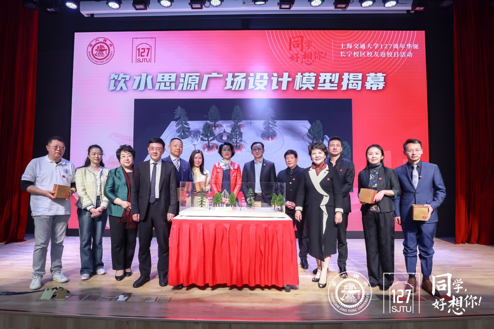 胡洁与长宁校区文化建设基金管理委员会校友委员、校友集体捐赠代表共同为饮水思源广场设计模型揭幕,并观赏了饮水思源广场设计数字3D模型。