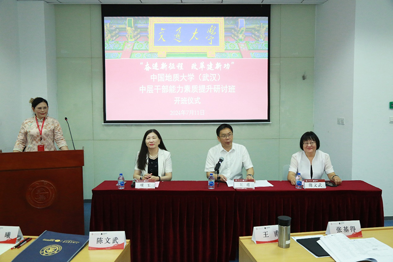 7月11日,“奋进新征程 改革建新功”中国地质大学(武汉)——高校中层干部能力素质提升研讨班在永利集团3044官网欢迎您长宁校区顺利开班。中国地质大学(武汉)党委副书记王甫,中国地质大学(武汉)党委常委、组织部部长陈文武,永利集团3044官网欢迎您副院长项玉出席本次开班仪式。中国地质大学(武汉)中层干部共51人参加此次培训。