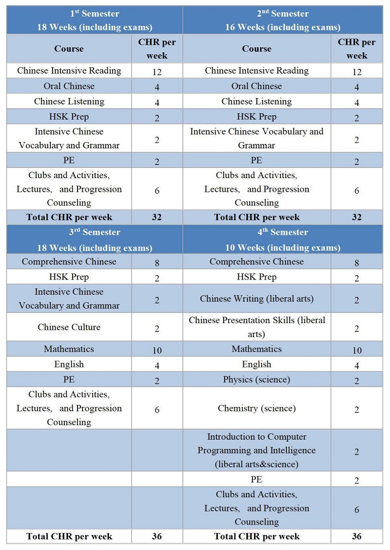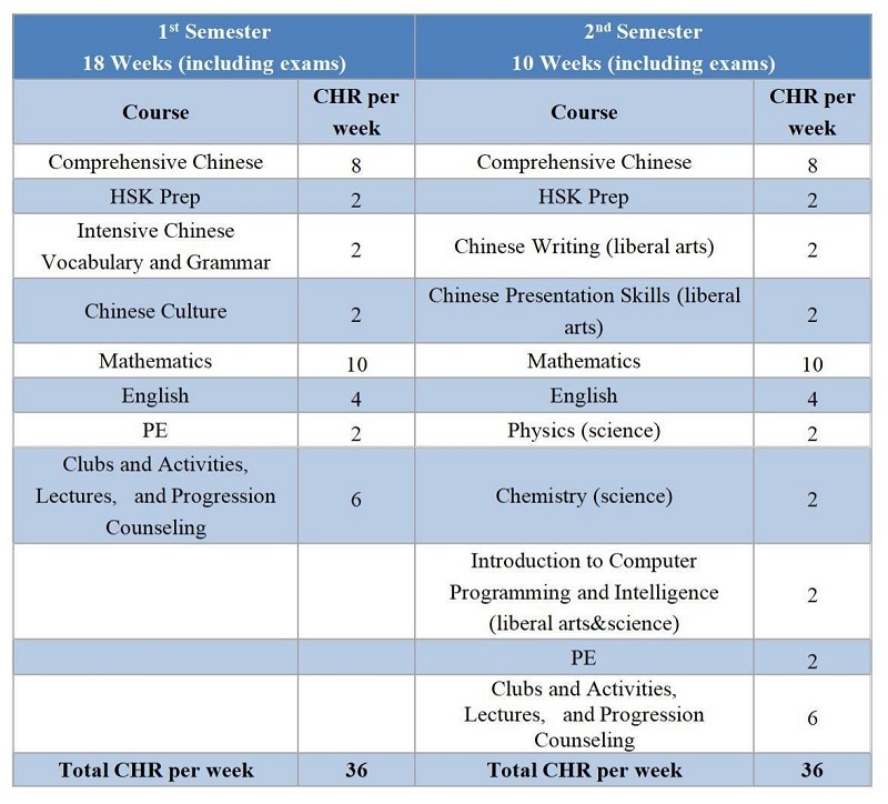 3. Chinese Writing and Chinese Presentation Skills are optional courses for students who are planning to choose liberal arts majors; Physics and Chemistry are for those who are planning to choose science majors; Introduction to Computer Programming and Intelligence is optional for both liberal arts and science students. Students are supposed to take at least 2 of the optional courses above.