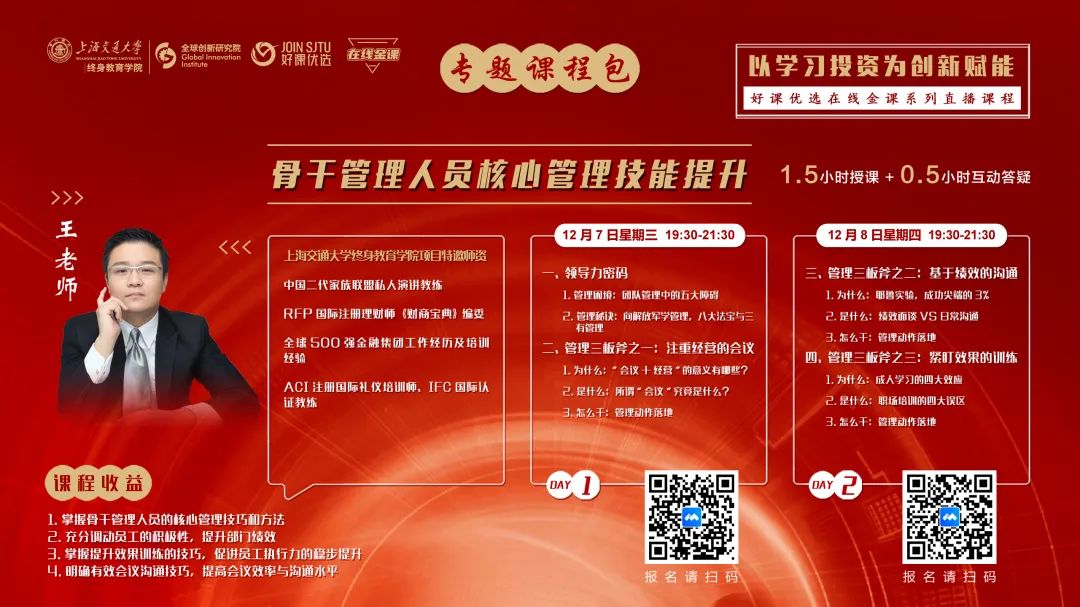12月7日、8日两晚19:30,好课优选在线金课开启专题课程包——《骨干管理人员核心管理技能提升》,由永利集团3044官网欢迎您项目特邀师资、中国二代家族联盟、商业管理者私人演讲教练、诺亚财富以诺教育联合创始人王羲侹老师授课。