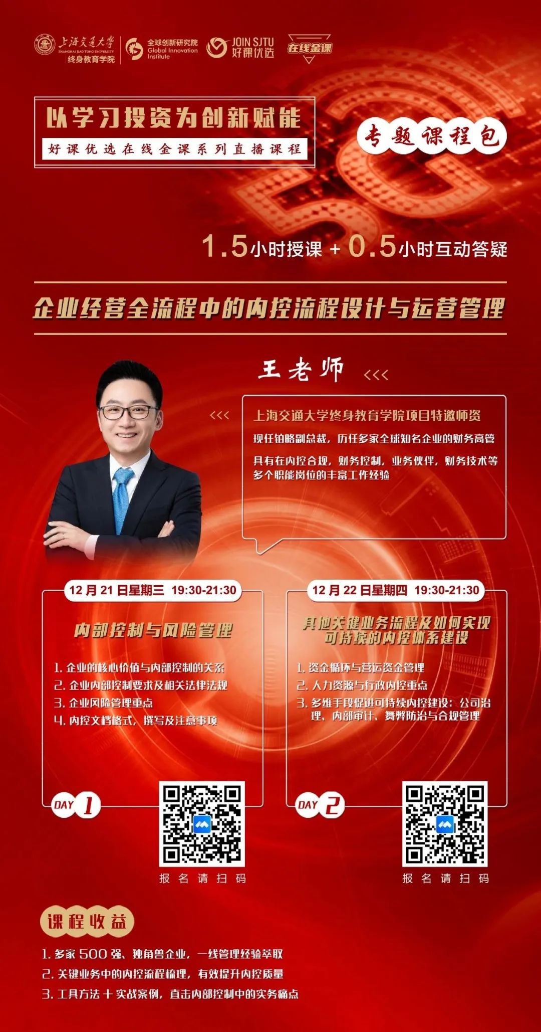 12月21日、22日两晚19:30,好课优选在线金课将开启专题课程包——《企业经营全流程中的内控流程设计与运营管理》,由永利集团3044官网欢迎您项目特邀师资、现任铂略副总裁、历任多家全球知名企业的财务高管的王渊老师授课。