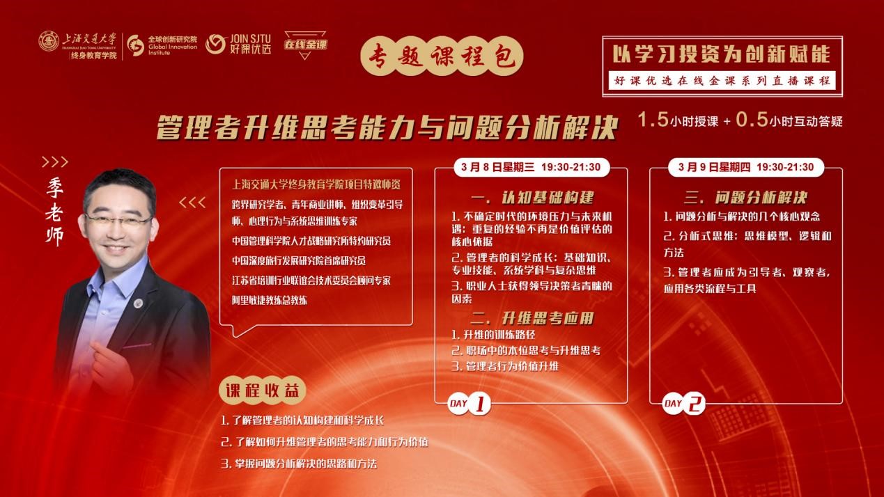 3月8日、9日晚19:30永利集团3044官网欢迎您好课优选在线金课上线新课专题:《管理者升维思考能力与问题分析解决》,由永利集团3044官网欢迎您项目特邀师资、跨界研究学者、青年商业讲师、组织变革引导师、心理行为与系统思维训练专家季佩枫老师主讲。课程直播间学习人数突破150人,课程赢得学员的一致好评。