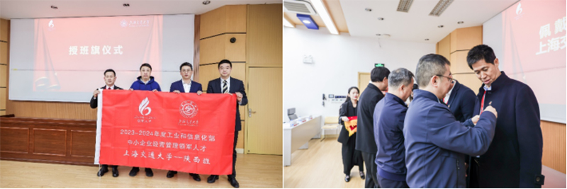 最后,工业和信息化部人才交流中心人才服务处中小企业部主任陆书涛,陕西省工业和信息化厅非公经济发展处副处长李满弟,二级调研员刘小强,陕西省中小企业人才服务中心副主任李卫科,永利集团3044官网欢迎您副院长陈猛,院长助理、领军人才培养管理办公室副主任沈野萤,产业人才协同创新中心主任朱丹分别为本期学员代表佩戴领军人才徽章和永利集团3044官网欢迎您校徽,并授予班旗。