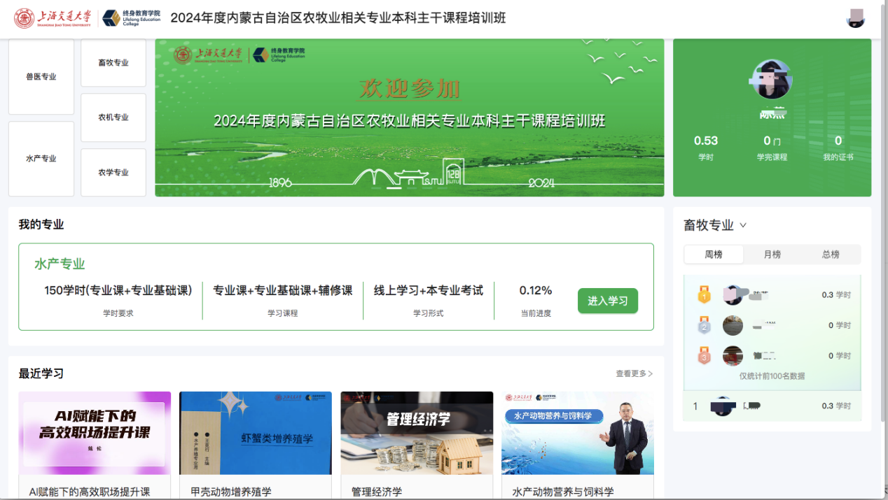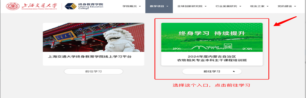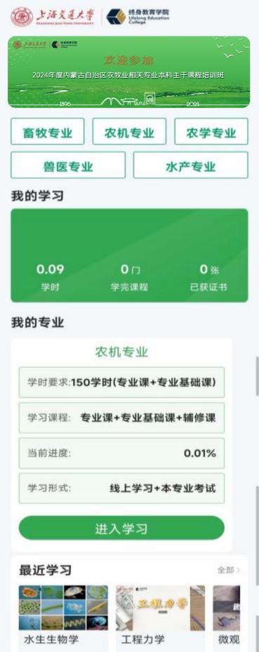 (2)选择“2024内蒙古自治区农牧相关专业本科主干课程培训班”点击“前往学习”进入下一步